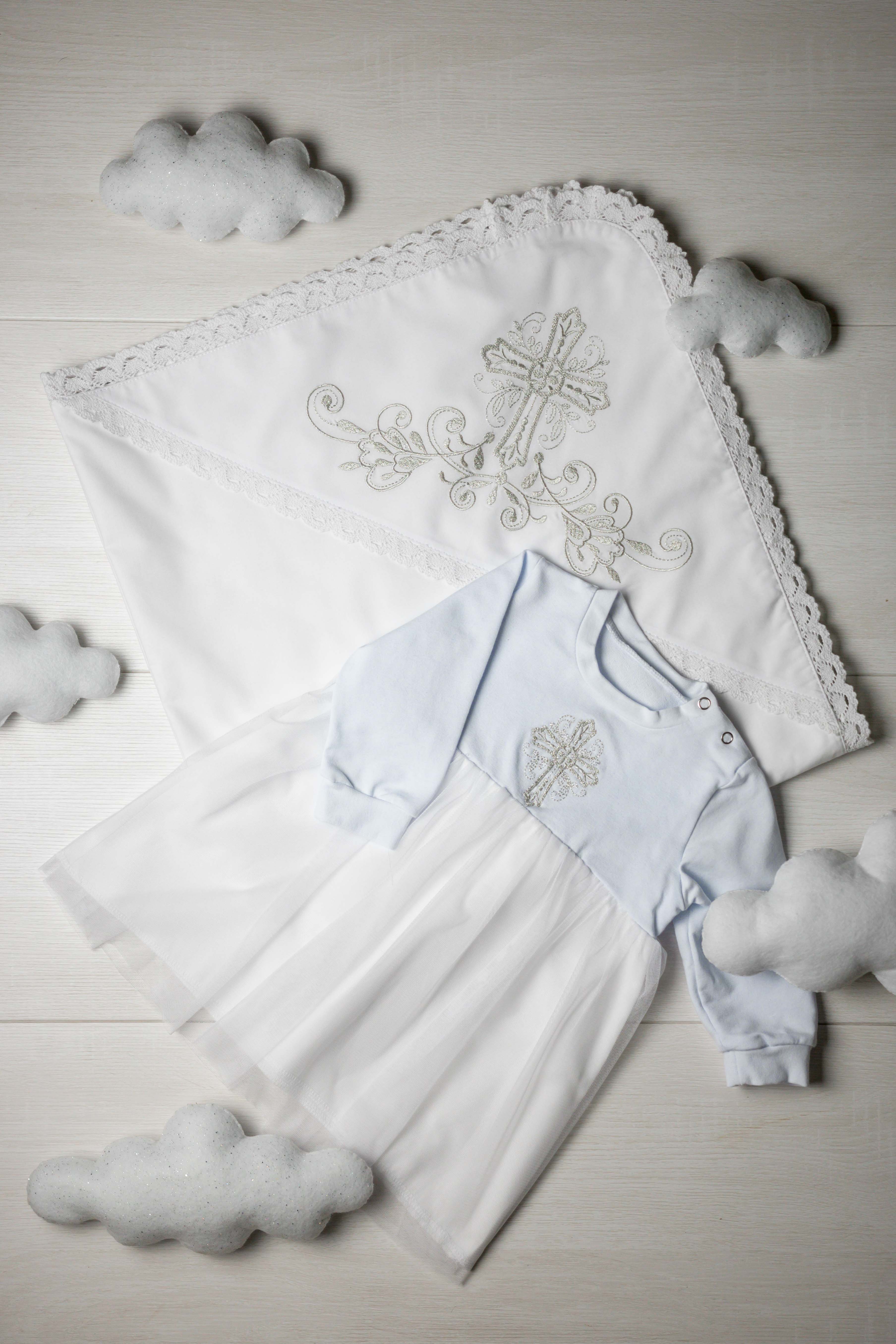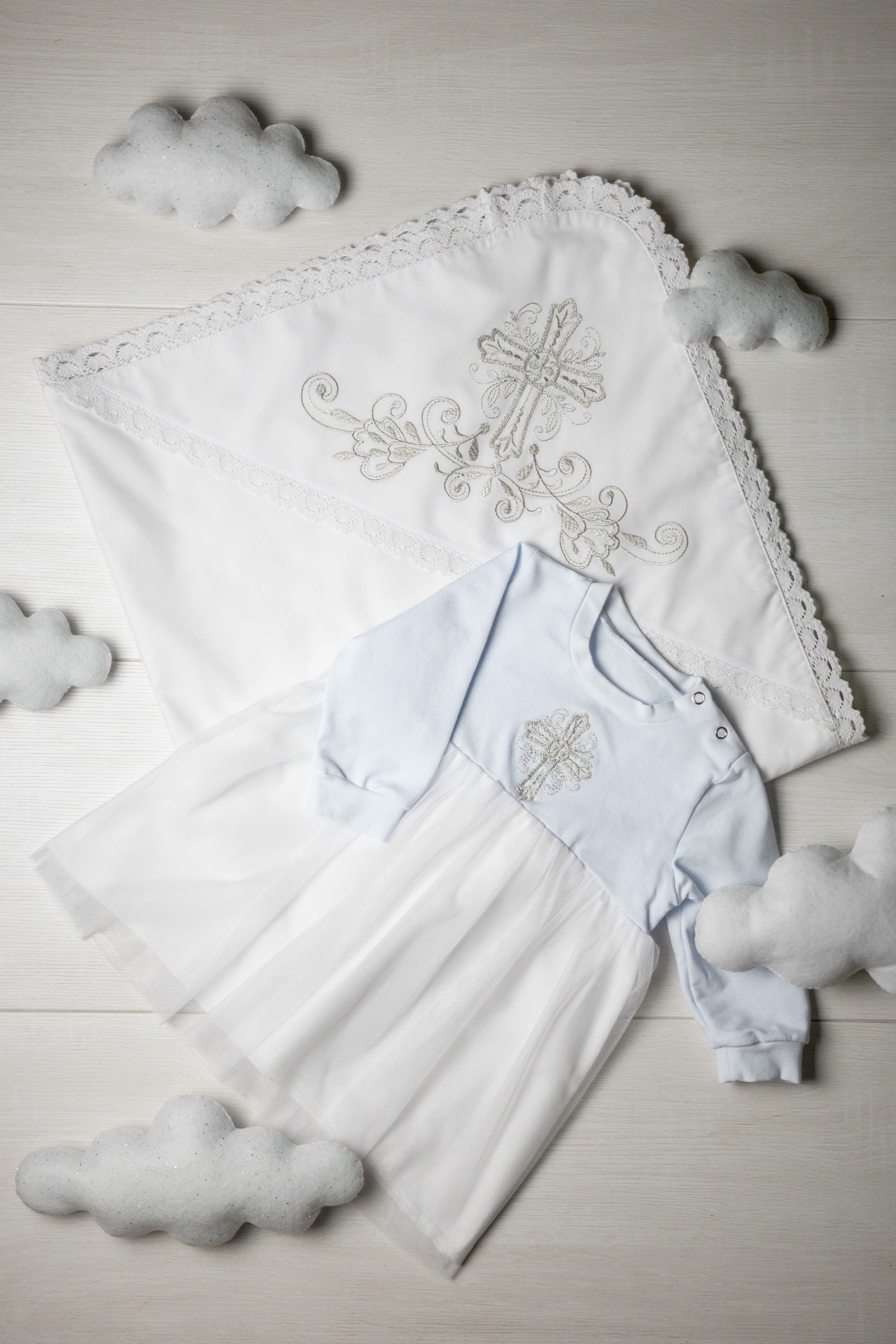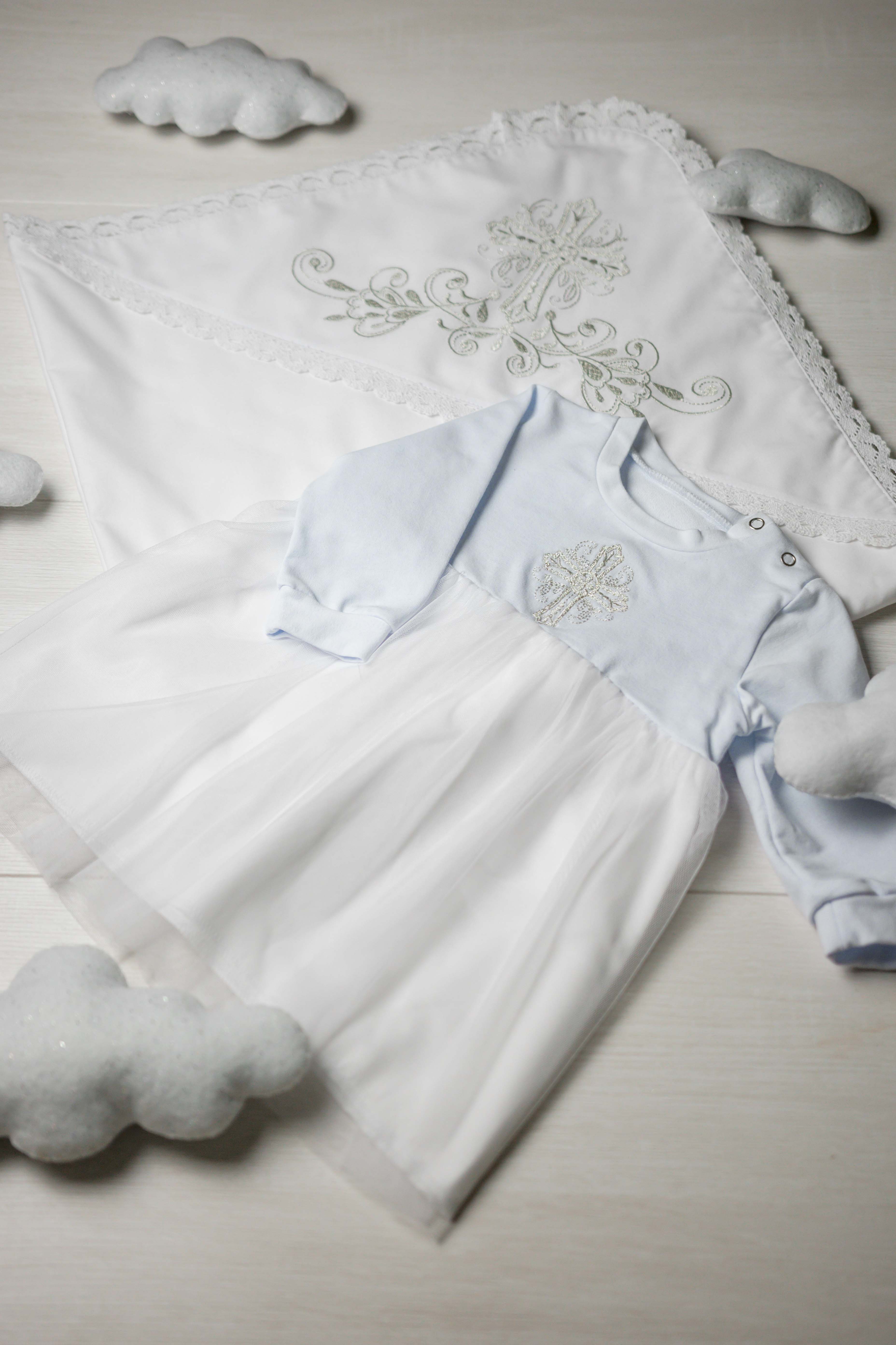 Ніжна біла сукня з довгим рукавом, прикрашена вишивкою. Верх виконаний з м’якої тканини (95% бавовна, 5% еластан), що забезпечує комфорт дитині. Низ зі струмливого фатину (поліестер), який надає образу легкості та святковості.