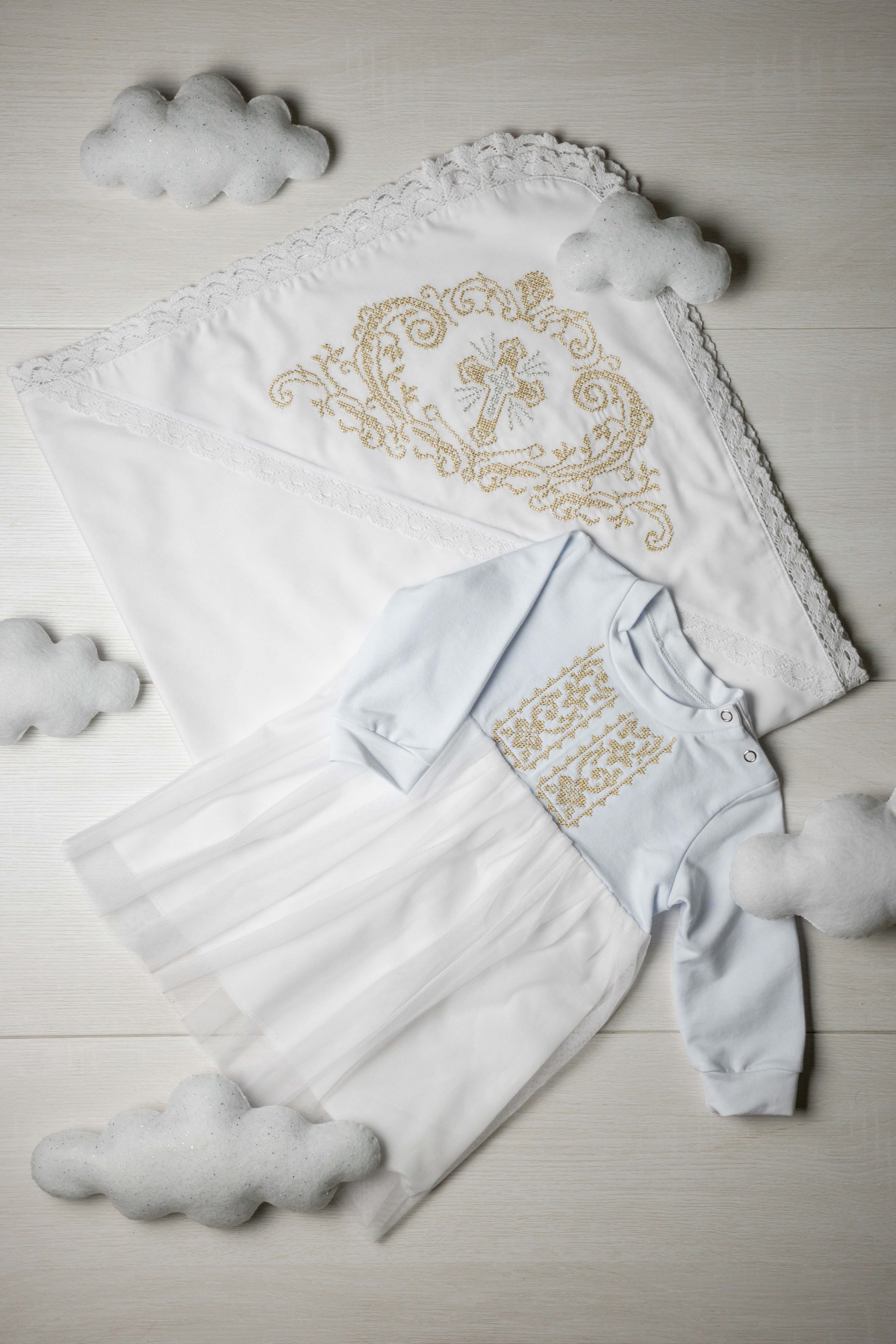 Ніжна біла сукня з довгим рукавом, прикрашена вишивкою. Верх виконаний з м’якої тканини (95% бавовна, 5% еластан), що забезпечує комфорт дитині. Низ зі струмливого фатину (поліестер), який надає образу легкості та святковості.