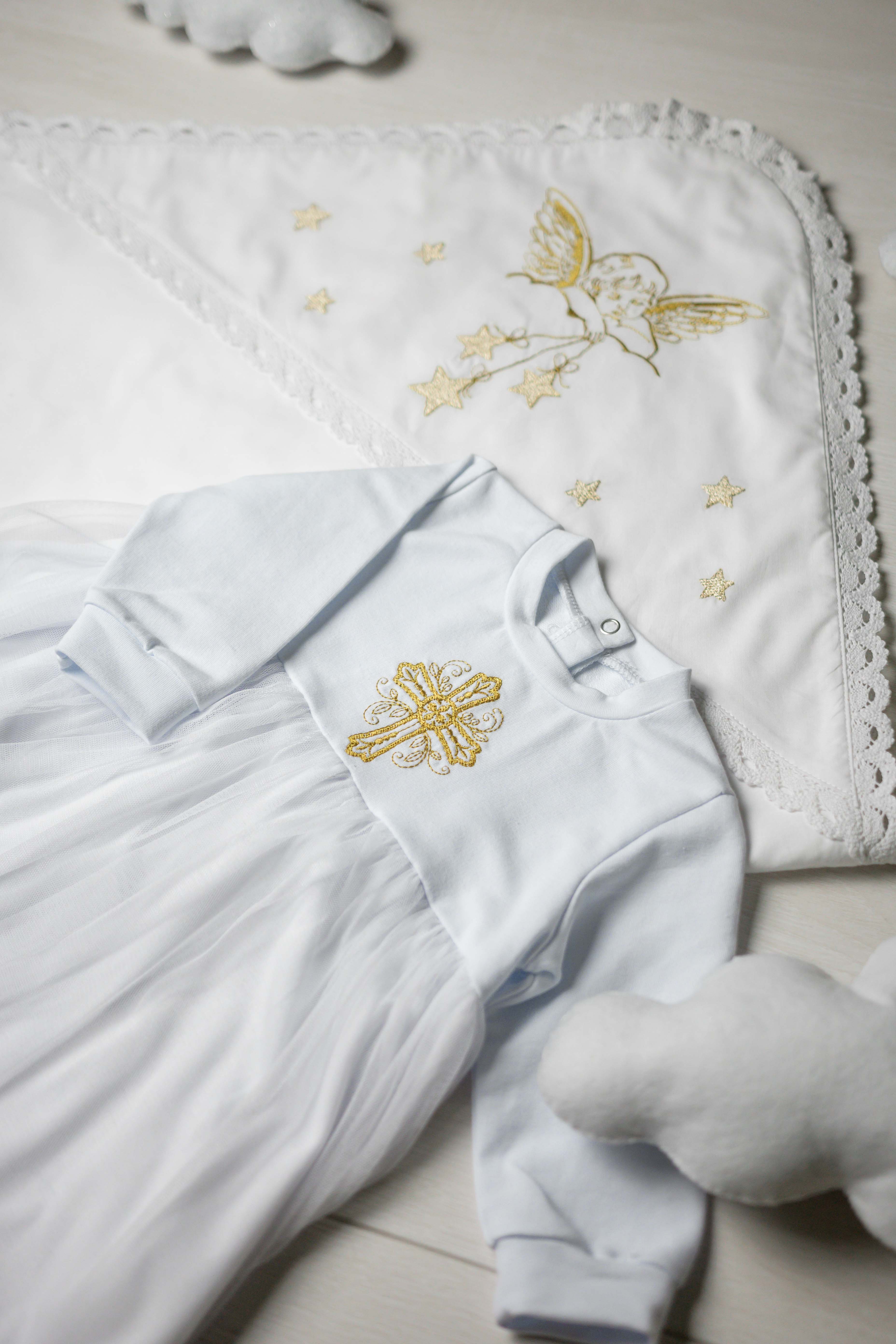 Ніжна біла сукня з довгим рукавом, прикрашена вишивкою. Верх виконаний з м’якої тканини (95% бавовна, 5% еластан), що забезпечує комфорт дитині. Низ зі струмливого фатину (поліестер), який надає образу легкості та святковості.