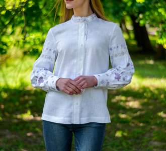 2630 ₴Біла вишиванка з довгими рукавами виготовлена з натурального льону з мереживом з фіолетовою вишивакою