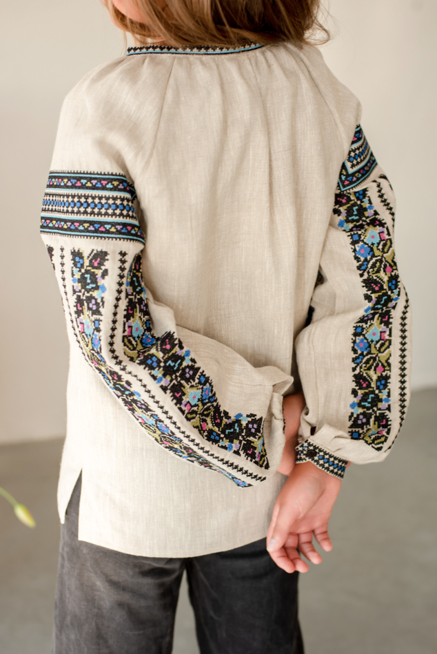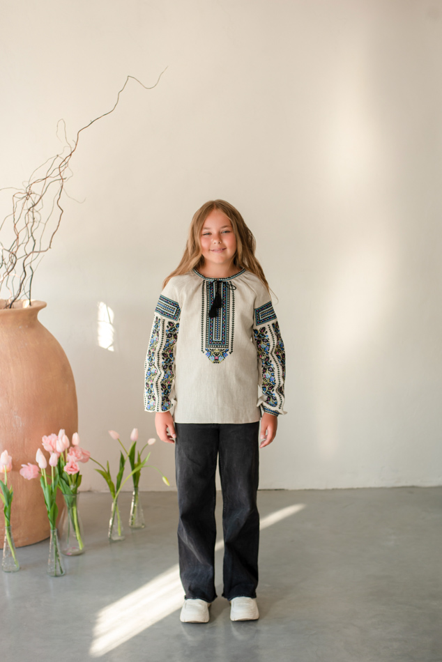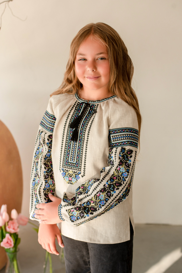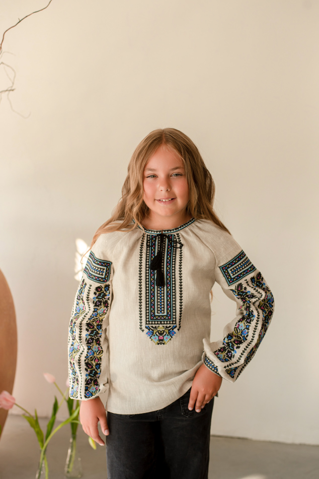 Дитяча вишиванка для дівчинки з натурального льону поєднує в собі витонченість традиційного стилю та комфорт сучасного одягу. Вишивка виконана хрестиком, що надає орнаменту чіткості, об’ємності та особливої виразності.