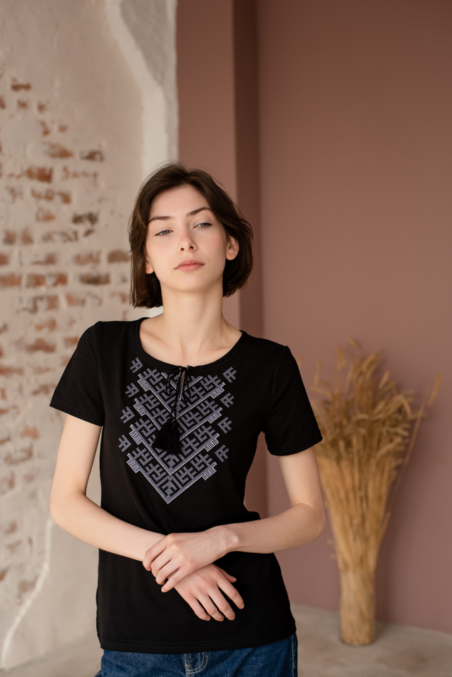 Крій класичний футболочний, з декоративною зав'язкою і розрізом на горловині в дусі традиційних вишиванок.