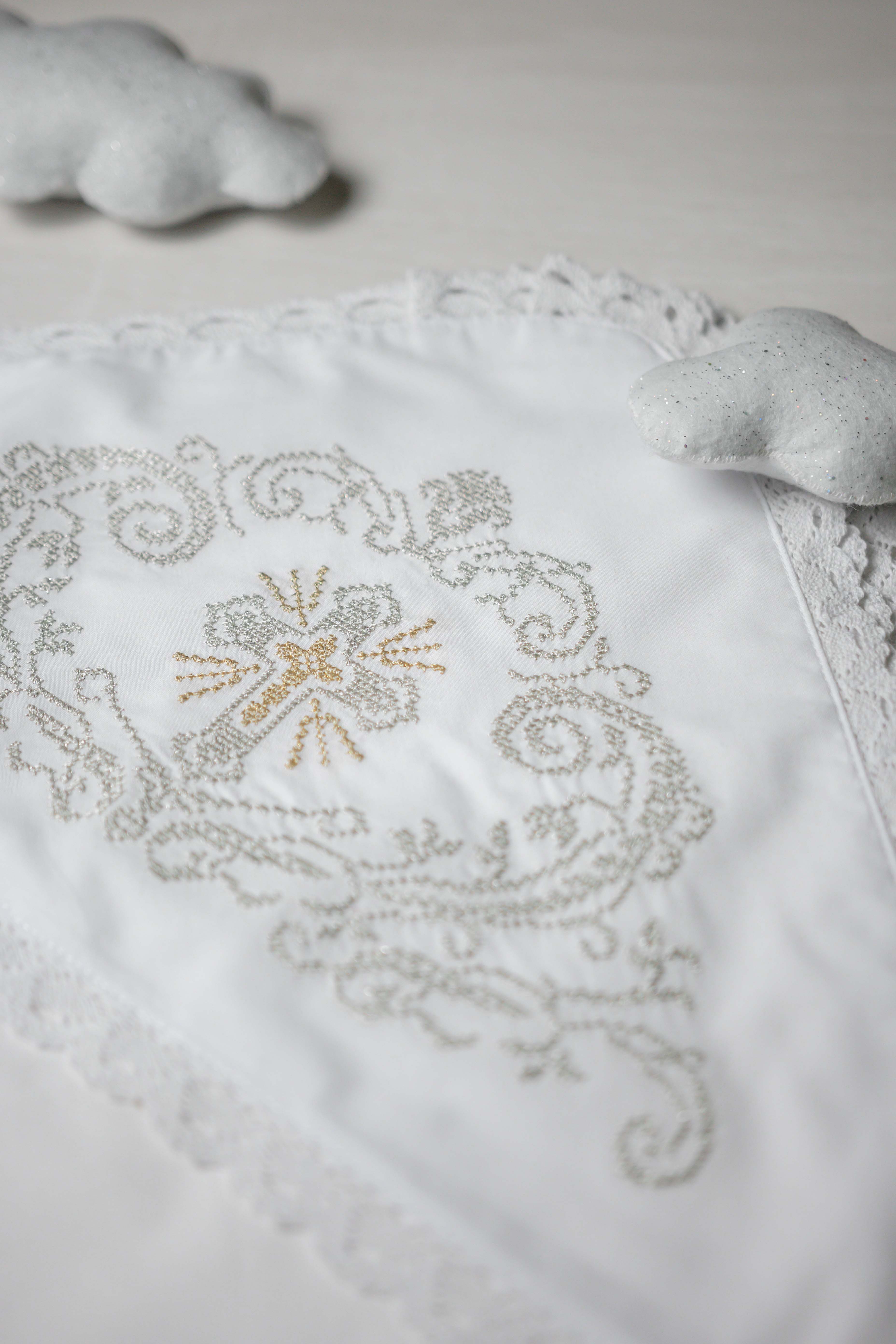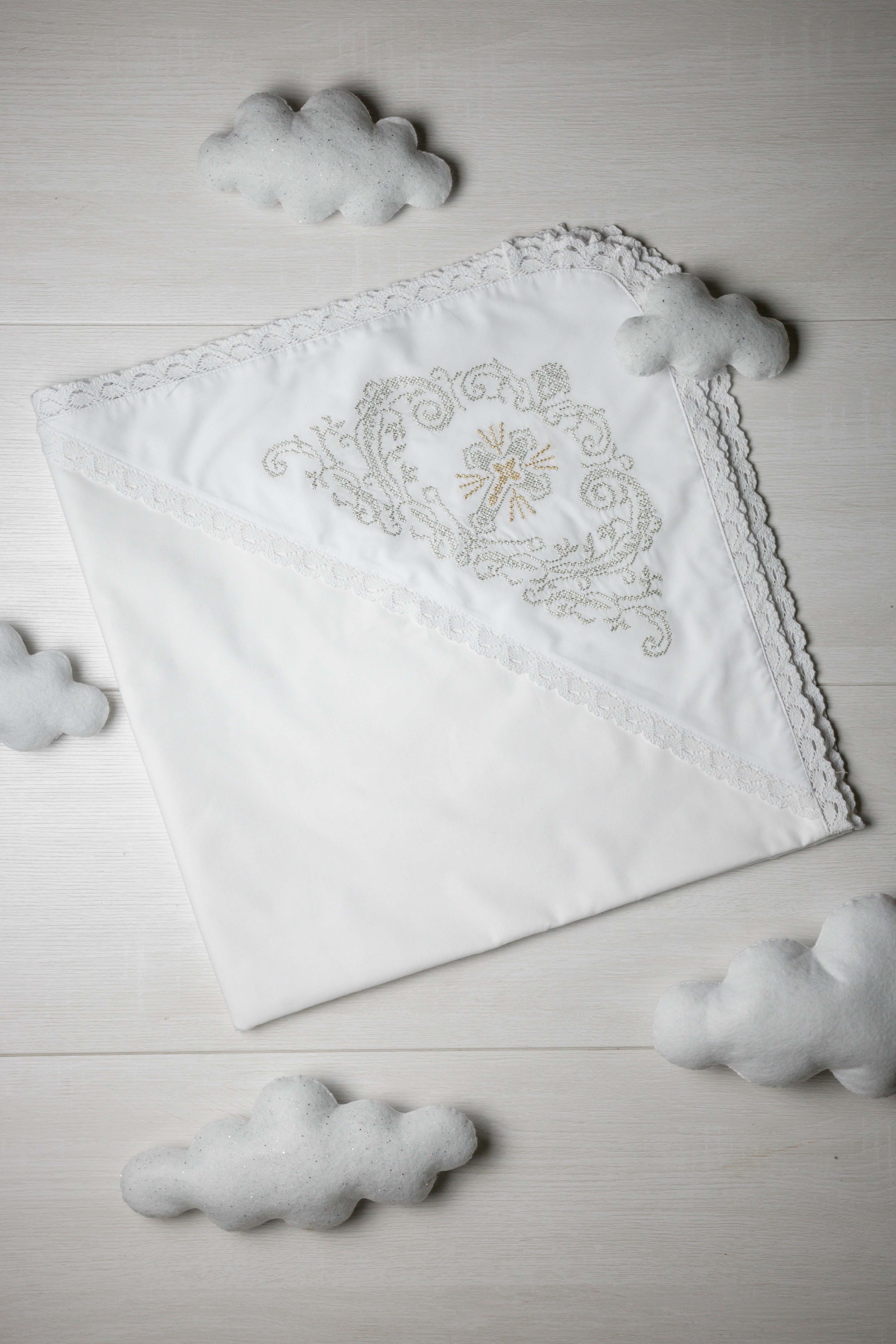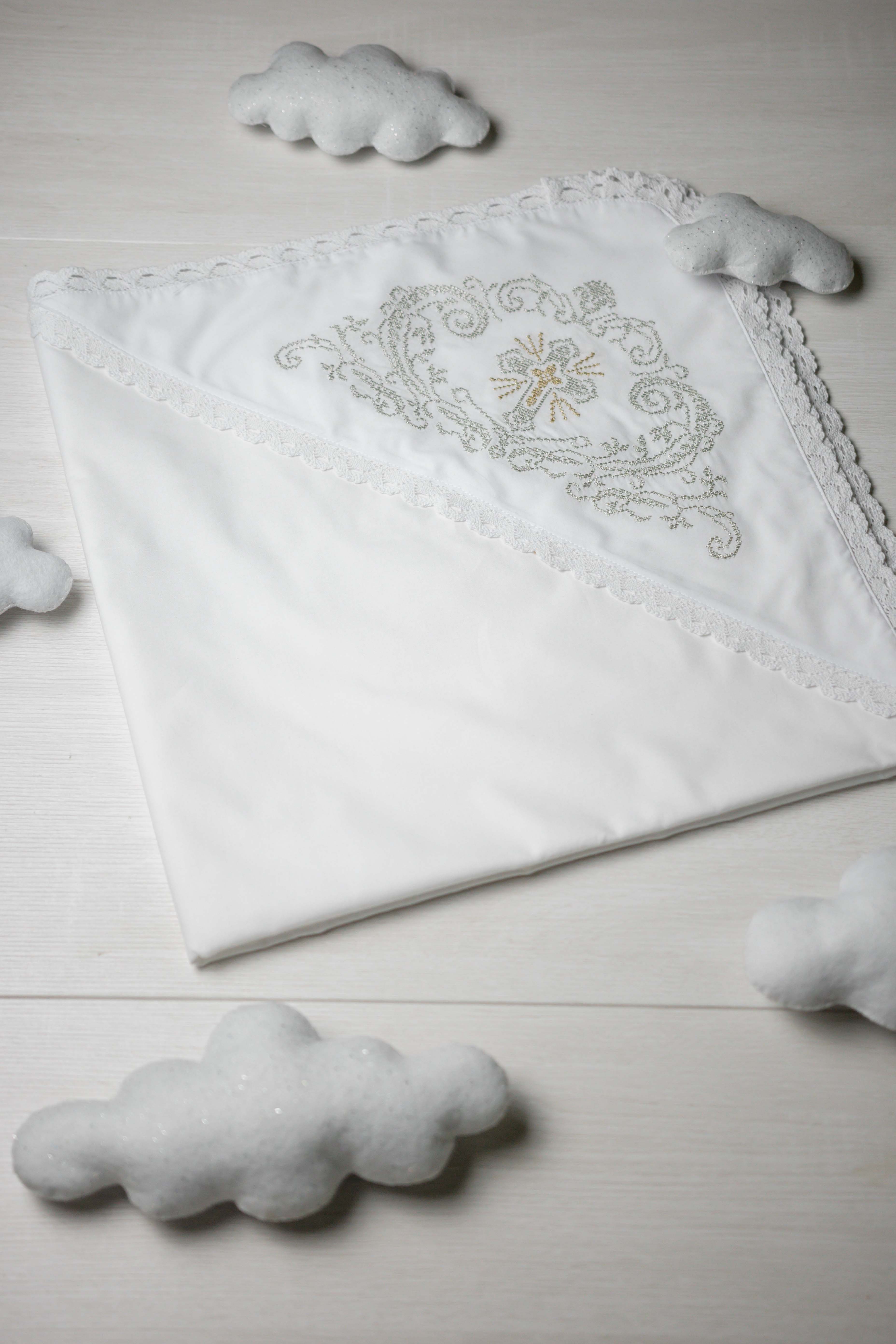 Крижма "Хрест хрестиком" срібло, з плюшем, бавовняне мереживо, арт.7059